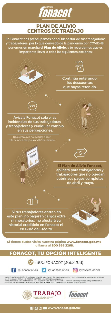 5. Este “Plan de Alivio” sólo aplica para pagos de nómina de los meses de abril y mayo de 2020, por lo que se debe estar atento en caso de continuar la pandemia del COVID-19, y de si el Infonacot amplía los beneficios del citado plan para los meses siguientes.