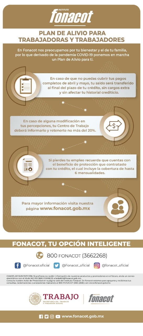 En virtud de la pandemia de COVID-19, el Instituto Mexicano de Contadores Públicos (IMCP) informa sobre la puesta en marcha del “Plan de Alivio para Trabajadores que tengan un crédito Fonacot” por parte del Instituto del Fondo Nacional para el Consumo de los Trabajadores (Infonacot).