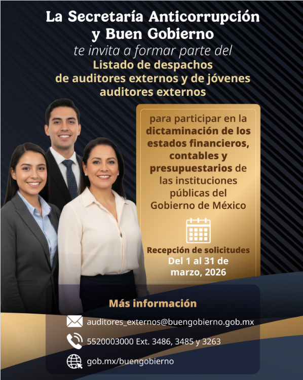 Por parte del del Instituto Mexicano de Contadores Públicos (IMCP), se comparte que la Secretaría Anticorrupción y Buen Gobierno ha iniciado el registro de firmas de auditores externos constituidas como personas morales para ingresar al Listado de despachos de auditores externos, cuya función es relevante para asegurar que el gobierno actúe con imparcialidad, transparencia y rendición de cuentas.