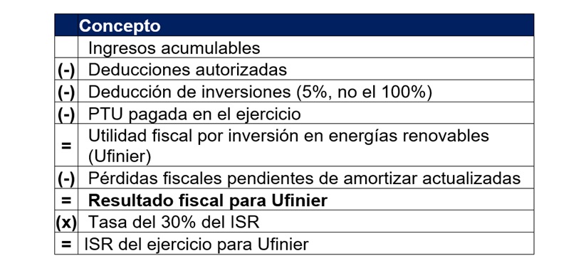 Para calcular la Ufinier, se parte del resultado fiscal del ejercicio, y en lugar de aplicar la deducción del 100% por la adquisición de maquinaria y equipo para la generación de energía renovable (de conformidad con el artículo 34.°, fracción XIII, de la LISR), se utilizará la deducción del 5% anual para maquinaria destinada a la generación, conducción, transformación y distribución de electricidad (según el artículo 35.°, fracción I, de la LISR), durante la vida útil del bien o hasta el ejercicio en que se genere la Ufin.