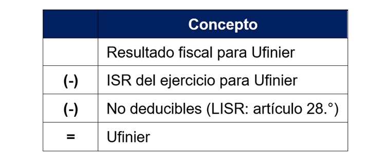 Para determinar la Ufinier, se debe partir del resultado fiscal del ejercicio correspondiente y restar el ISR del ejercicio para la Ufinier, así como los gastos no deducibles en términos del artículo 28.° de la LISR, como se detalla a continuación: