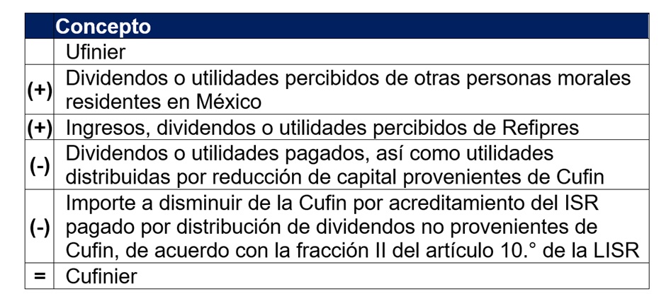 Una vez determinada la Ufinier, se procederá a calcular la Cufinier. Para ello, se partirá de la Ufinier y se adicionarán los dividendos o utilidades recibidos de otras empresas nacionales, así como los ingresos, dividendos o utilidades percibidos de Regímenes Fiscales Preferentes (Refipres). Además, se deberá restar los dividendos o utilidades distribuidas por reducción de capital provenientes de la Cufin, así como los montos de acreditamiento de ISR pagado por distribución de dividendos que no provengan de la Cufin, como se detalla a continuación: