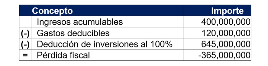 La empresa “X”, S.A. de C.V., cerró en el ejercicio 2019 con las cifras suscritas. A continuación, se presenta una tabla que ejemplifica el procedimiento para determinar el resultado fiscal de la compañía, el cual resultó en una pérdida fiscal. Este cálculo incluye la deducción del 100% por la adquisición de maquinaria y equipo destinados a la generación de energía renovable: