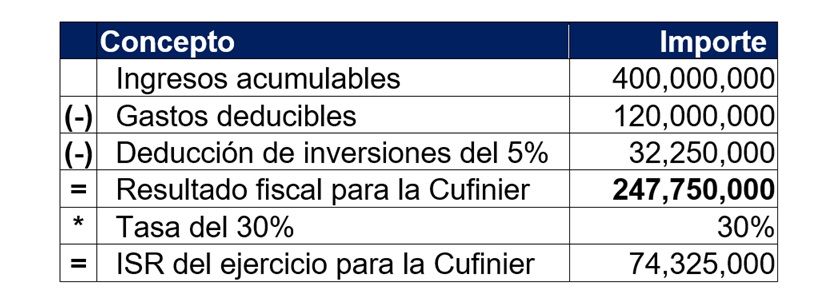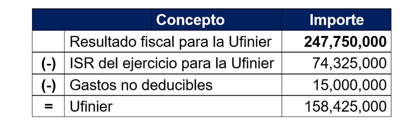 En el siguiente ejemplo se muestra la determinación de la Ufinier, que se calcula a partir del resultado fiscal para efectos de la Cufinier, que en este caso es de 247,750,000, conforme al ejemplo anterior: