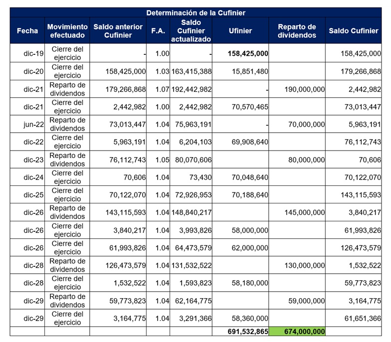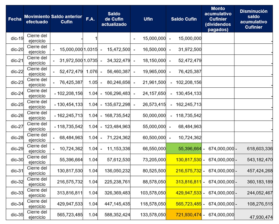 Como se puede observar en la celda resaltada en verde, la compañía ha generado un saldo en la Cufin en diciembre de 2029. En consecuencia, deberá restar de forma acumulada el saldo registrado como distribución de dividendos provenientes de la Cufinier, lo que impedirá el reparto de dividendos de esta fuente (ver celdas marcadas en amarillo). Este efecto se extinguirá hasta el ejercicio 2035, como se indica en la celda resaltada en naranja.
