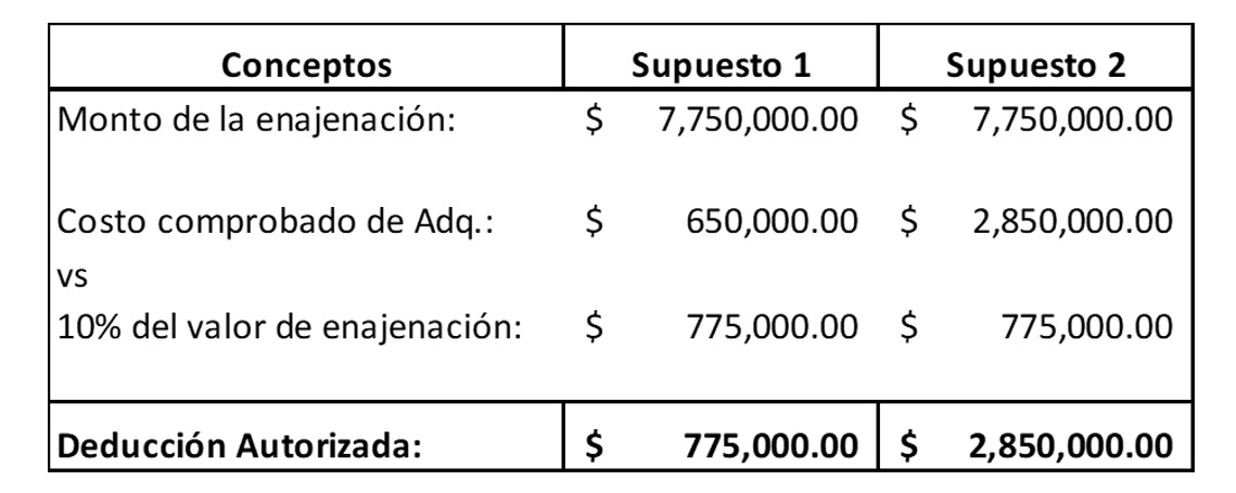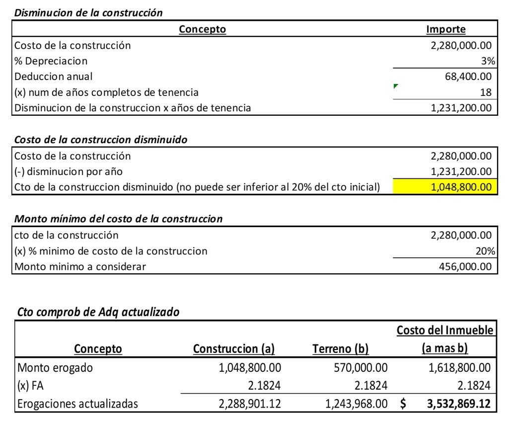 Como se ha explicado en el boletín, la mecánica pudiera no resultar tan fácil. No obstante, en términos generales, el mismo se determina con base en la ganancia obtenida al confrontar el ingreso con las deducciones que permite la LISR para estas operaciones, tales como el costo comprobado de adquisición actualizado; el importe de las inversiones actualizadas hechas en construcciones, mejoras y ampliaciones; los gastos notariales, impuestos y derechos, por escrituras de adquisición y de enajenación; así como el impuesto local por los ingresos por enajenación de bienes inmuebles, pagados por el enajenante, junto con las comisiones y mediaciones también pagadas por el mismo.