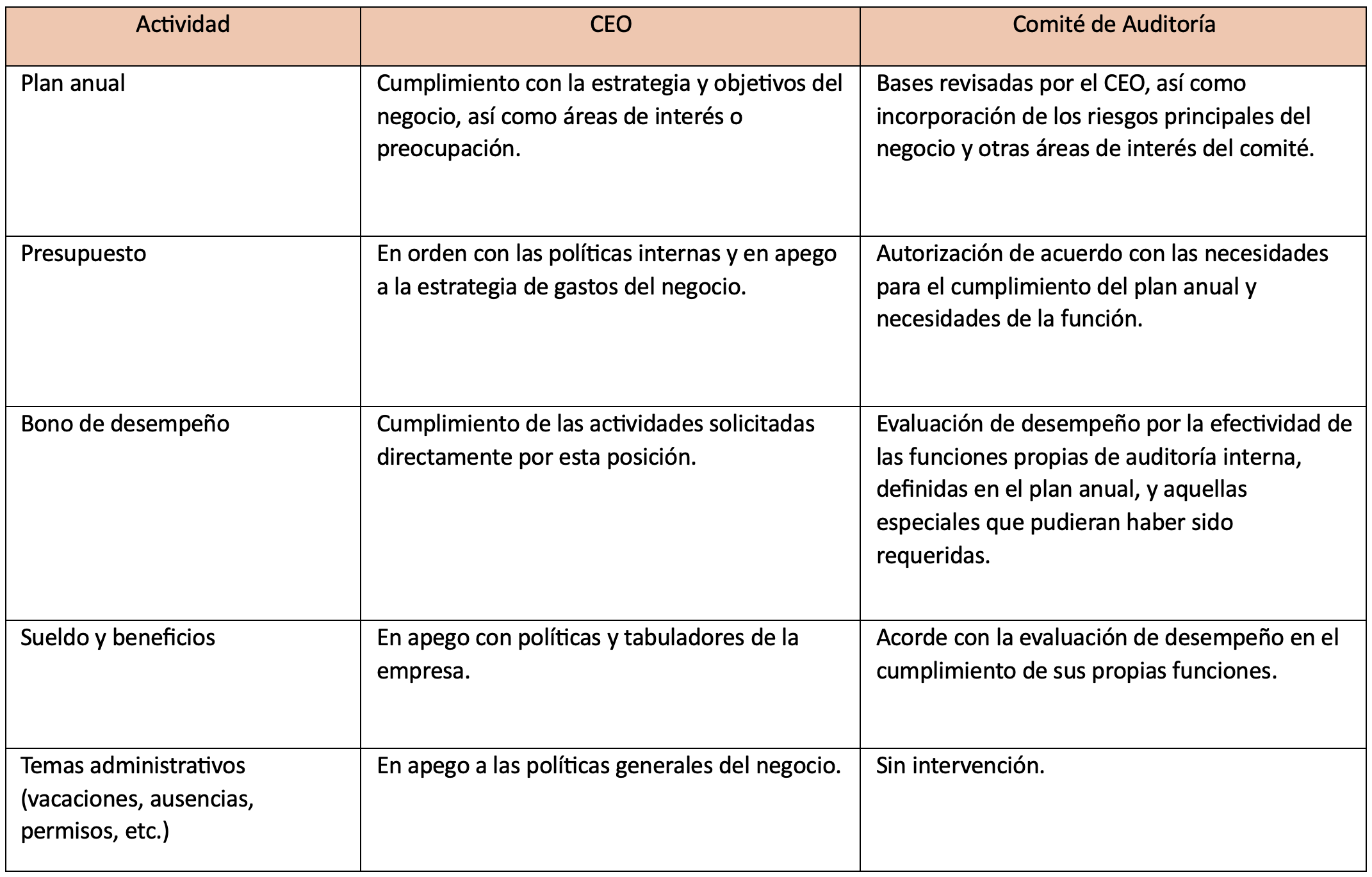 Sobre esta base, hay distintas actividades que el propio CEO del negocio deberá validar con el responsable de auditoría interna, aún y cuando éstas se presenten posteriormente al Comité de Auditoría para su aprobación. Entre las más relevantes se encuentran: