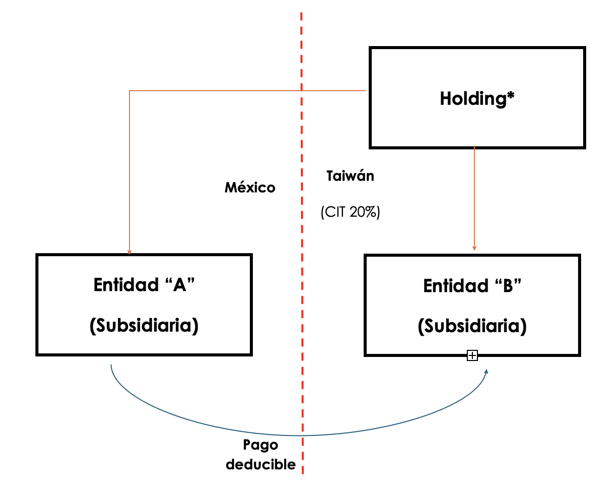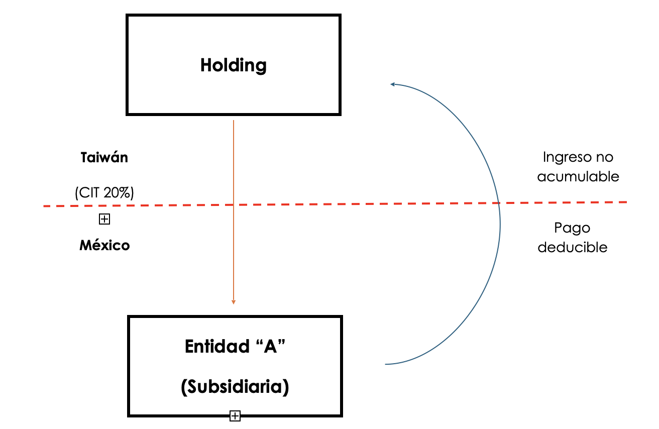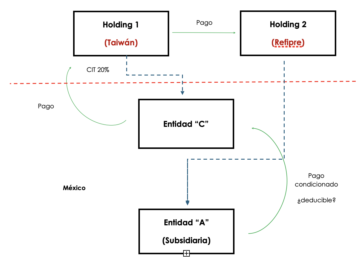 Es decir, este esquema sería no deducible, debido a que el pago de la contraprestación se encuentra en función de pagos realizados a regímenes preferentes, aun y cuando el contribuyente no se beneficie de manera directa, pues sus partes relacionadas se ven beneficiadas con los pagos intercompañía efectuados por la subsidiaria.
