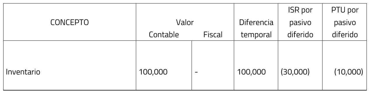 El inciso a) indica que debe reconocerse un pasivo diferido cuando el valor contable es mayor al valor fiscal: esto se observa cuando una compañía no cumple con los requisitos fiscales de su inventario, el cual será en un futuro no deducible.