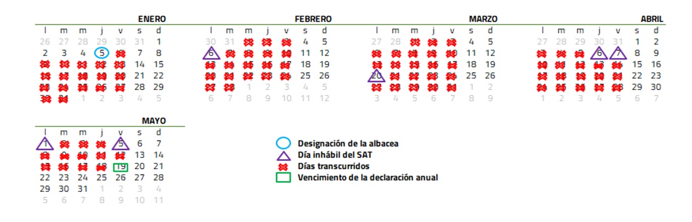Tales obligaciones son cumplidas por el albacea y están definidas en los artículos 92.° de la LISR, 146.° del RLISR y 32.° de la Ley del Impuesto al Valor Agregado (LIVA). El albacea es responsable solidario por las contribuciones causadas durante el periodo de su encargo, conforme a la fracción VII del artículo 26.° del CFF, a saber: