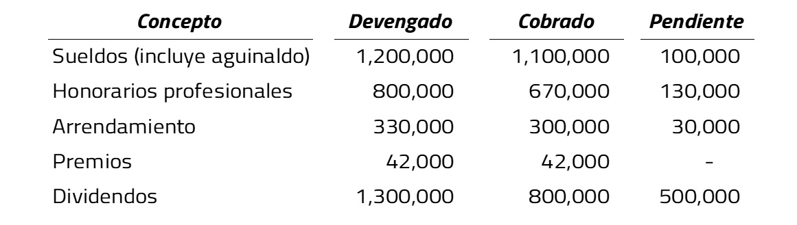 También acumularán los ingresos de los dividendos cobrados en febrero de 20X2 y los ingresos por arrendamiento de enero a mayo y de junio a diciembre del inmueble “A” al 100% para el caso de la cónyuge, y los ingresos de enero a mayo y de junio a diciembre en un 50% para el caso de los hijos, sin informar nada (respecto a estos montos) en su declaración anual.