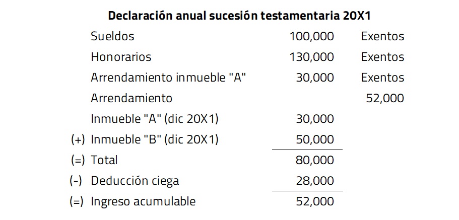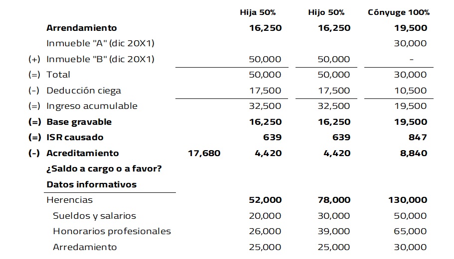 Por ejemplo, del inmueble “A”, la cónyuge acumulará el 100% de los ingresos por arrendamiento, derivado de la proporción que estipuló el contribuyente, y por el inmueble “B”, los hijos acumularán el 50% de los ingresos obtenidos por la renta del mes de diciembre, acreditando el ISR que se pagó en la declaración anual de la sucesión testamentaria 20X1 en su proporción.