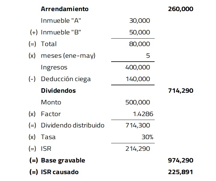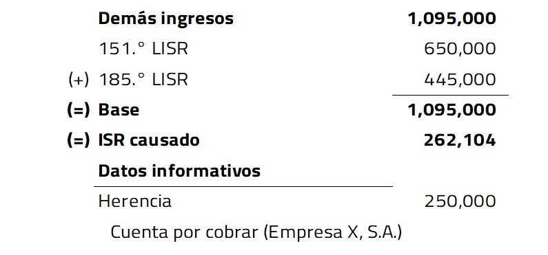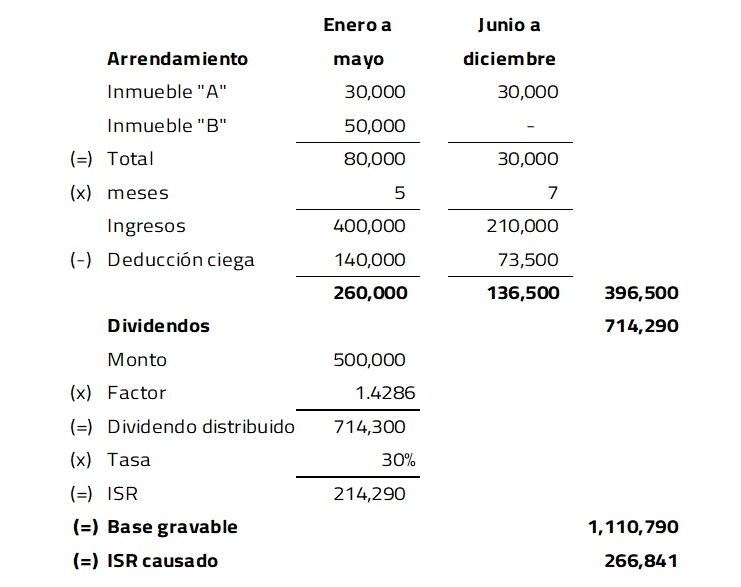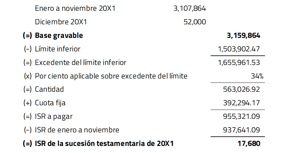 En otras palabras, para obtener la base gravable, se suman los ingresos de enero a noviembre de 20X1 y los ingresos por el arrendamiento de la sucesión testamentaria. Al resultado se le aplica la tarifa anual y se resta el ISR que se causó anteriormente.