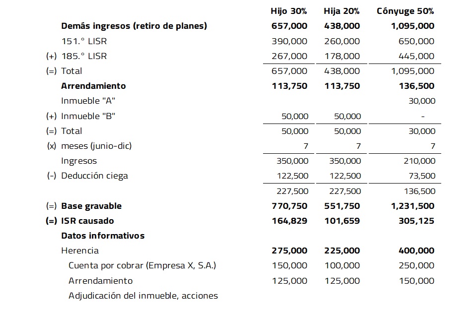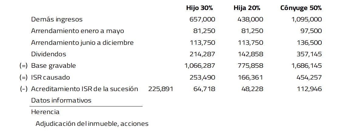 Cada heredero acumulará los ingresos correspondientes a 20X2, respecto de su porcentaje de adquisición. Por ejemplo, el hijo acumulará el 30% de los ingresos de los planes de ahorro, la hija el 20% y la cónyuge el 50%. De los ingresos por arrendamiento, se tendrán en cuenta de junio a diciembre, es decir, siete meses. Los hijos considerarán el 50% del inmueble “B”, derivado de que ya fue escriturado por ambos y la cónyuge considerará los ingresos del inmueble “A” al 100 por ciento.