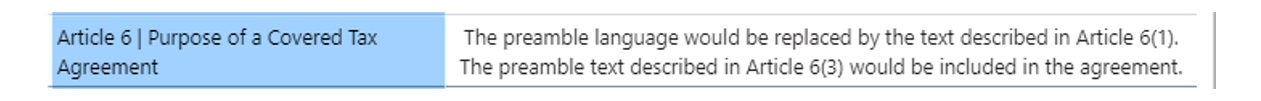 El preámbulo del CDI actual sería reemplazado por el artículo 6.°, párrafo 1. Asimismo, el texto del párrafo 3, del artículo 6.° del MLI se adicionaría al preámbulo. De esta manera. el preámbulo quedaría de la siguiente manera: