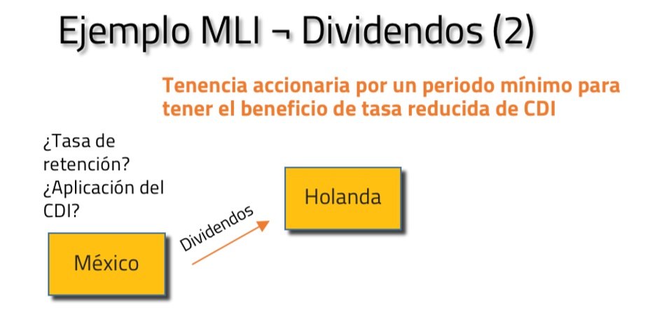 El artículo 8.°, párrafo 1, aplicará en relación con lo establecido en el artículo 10.° (párrafo 2, inciso a) del CDI entre México y los PB. De esta manera, el beneficio de no retención quedaría condicionado a: que el beneficiario efectivo sea una persona moral que sea dueña de cierto volumen de acciones (al menos 10% del capital), y que el periodo de tenencia sea de al menos 365 días.