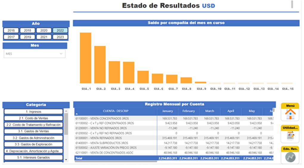 El tablero de Estado de Resultados muestra los rubros y último nivel de detalle de las cuentas por cada mes, incluyendo a todas las compañías por un horizonte de 8 años: