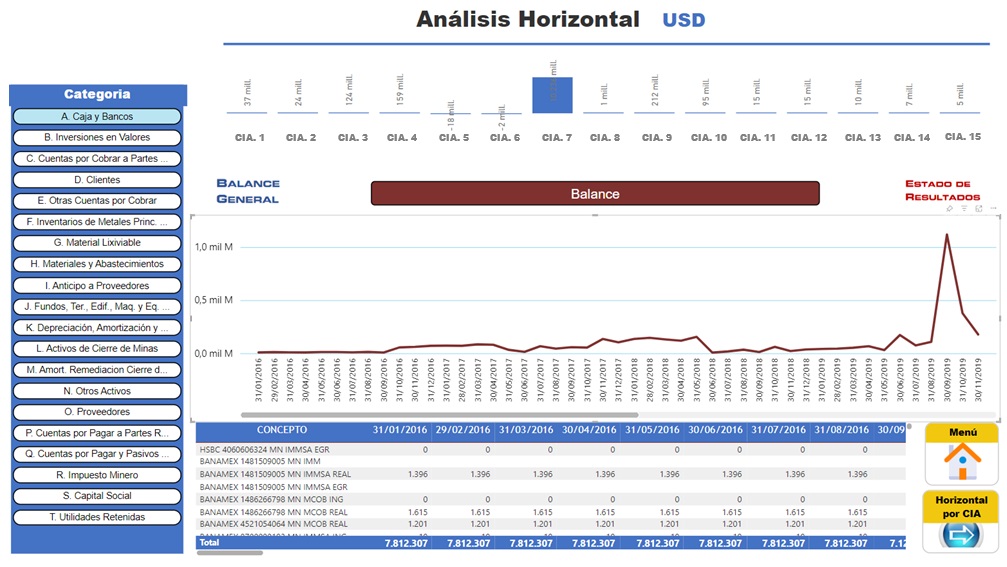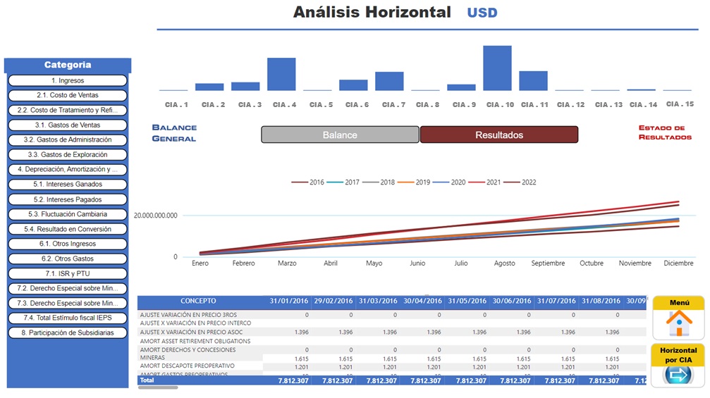 El tablero de Análisis Horizontal muestra la información financiera a lo largo del tiempo, con una visualización de tendencias, lo que permite identificar variaciones en los rubros y cuentas a último nivel de detalle. Además, se incluye a todas las compañías por un horizonte de 8 años y se contemplan visualizaciones diferentes para el Balance General (saldos) y para el Estado de Resultados (acumulativo):