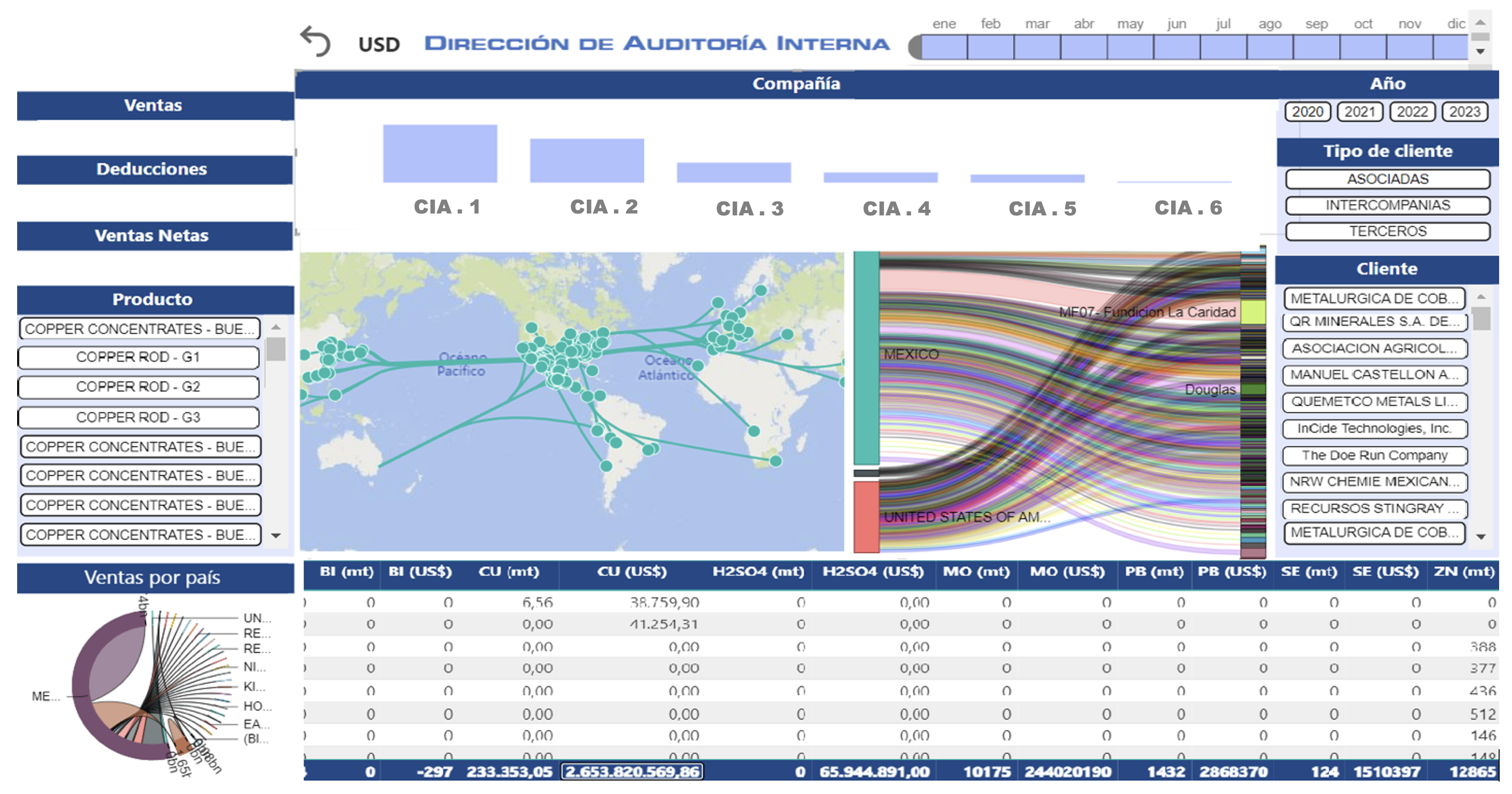 El TAI de Ventas a nivel División muestra todas las transacciones a nivel detalle y las visualizaciones revelan en orden de importancia las compañías que facturan, los productos vendidos, los clientes, los orígenes y destinos de cada venta, el tipo de cliente, los meses y años en que ocurrieron, así como una tabla con detalles operativos como factura, embarque, aduana, contenidos y valores de cada producto vendido, incluyendo deducciones y premios.