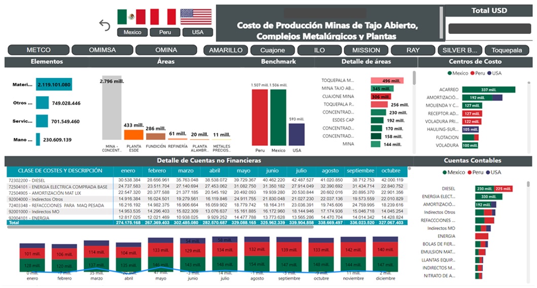 El TAI de Benchmark de Costos de Producción a nivel División muestra todos los países, compañías, minas, plantas, procesos y subprocesos operativos, clasifica los costos incurridos por elementos de costeo, como son materiales, mano de obra, indirectos y otros. Además, señala la información financiera por cuenta contable a último nivel de detalle de cada mes. Incluye también contabilidad administrativa, al mostrar la información en función a su Centro de Costos por área de responsabilidad.