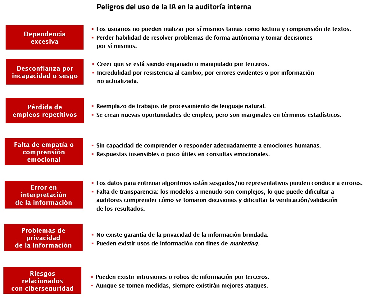 Es primordial mencionar que, a pesar de los riesgos que implica el uso de la IA, la auditoría interna no puede quedarse al margen de su uso, debido a que la situación exige que la función provea servicios de aseguramiento sobre la misma, en caso de que ésta sea utilizada por la administración. Por ello, es necesario que el CAE asegure la proficiencia de su equipo en este tema, siendo también conveniente que se analice en qué contextos puede aportar valor a la función y sacar provecho de sus beneficios desde etapas tempranas, toda vez que se cuiden los riesgos mencionados.