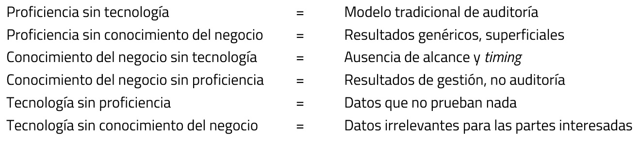 La construcción y el uso de aplicaciones y herramientas tecnológicas en auditoría no garantiza su efectividad. Para lograr que se aporte valor a las partes interesadas, es necesario que el Chief Audit Executive (CAE, o Director Ejecutivo de Auditoría) y su equipo cuenten con tres aspectos interrelacionados: proficiencia en metodología de auditoría interna, conocimiento profundo del negocio y uso de tecnología para la auditoría interna.