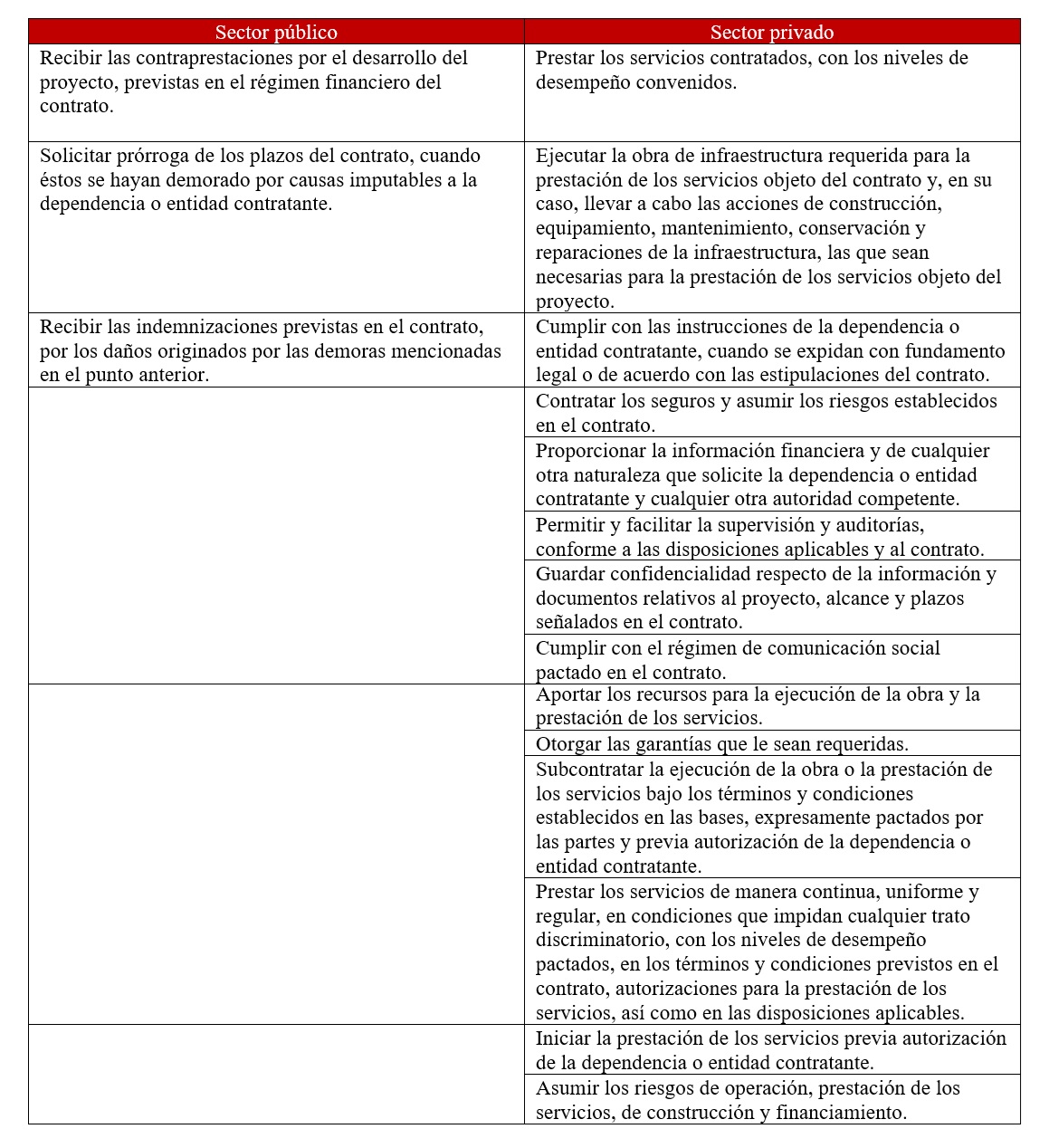 Los modelos de prestación de servicios públicos en nuestro país consideraban en sus alcances el desarrollo de infraestructura principalmente carretera, hidráulica y hospitalaria, integrando en algunos casos mecanismos de contratación de personal bajo el esquema outsourcing, a través de un inversionista de la iniciativa privada, para lo cual en su diseño se consideraba su vinculacion al Plan Nacional de Desarrollo (PND) y demás programas sectoriales, institucionales, regionales y especiales vinculados a la dependencia o entidad solicitante y el análisis costo-beneficio requerido por la SHCP para determinar su viabilidad presupuestal y financiera. A la vez, se consideraba el valor de la infraestructura y servicios a prestar en el largo plazo, junto con el plazo de recuperación de la inversión y rentabilidad para el inversionista privado, así como el impacto presupuestario y horizonte de obligaciones para la institución pública; en su caso, la generación de ingresos además del diseño del procedimiento de contratación a seguir, la formalización de un contrato de servicios a largo plazo entre la dependencia o entidad contratante y el inversionista, que defina de forma clara las especificaciones y descripción de los servicios durante la vigencia del contrato a través de los activos construidos o proporcionados por el inversionista proveedor, los anticipos requeridos, la asignación de riesgos entre la dependencia o entidad contratante y el inversionista proveedor y, en su caso, las condiciones para la adquisición de los activos generados, vinculando incluso el financiamiento de organismos financieros internacionales, como fue el caso del Banco Mundial y el Banco Interamericano de Desarrollo. Es ejemplo de lo anterior el Hospital Regional del Bajío y su unidad de apoyo, ubicado en el estado de Guanajuato, adjudicado en un procedimiento de licitación pública el 10 de marzo de 2005 a la empresa española Acciona, S.A., con una vigencia de 20 años.