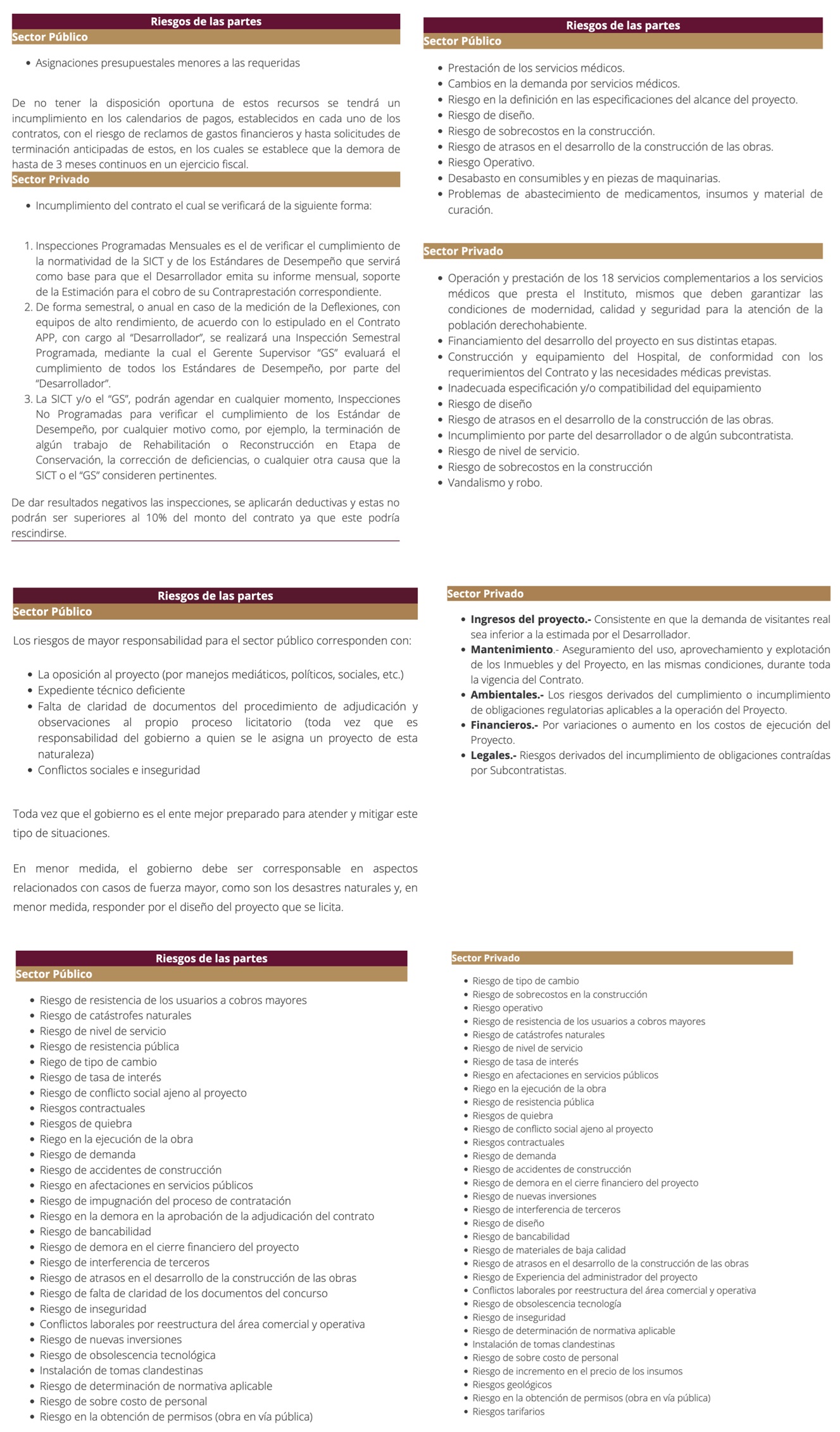 A manera de ejemplo, se ilustra un extracto de algunos riesgos considerados en el diseño de diversos proyectos APP, en los que pueden incurrir el sector público y el sector privado: