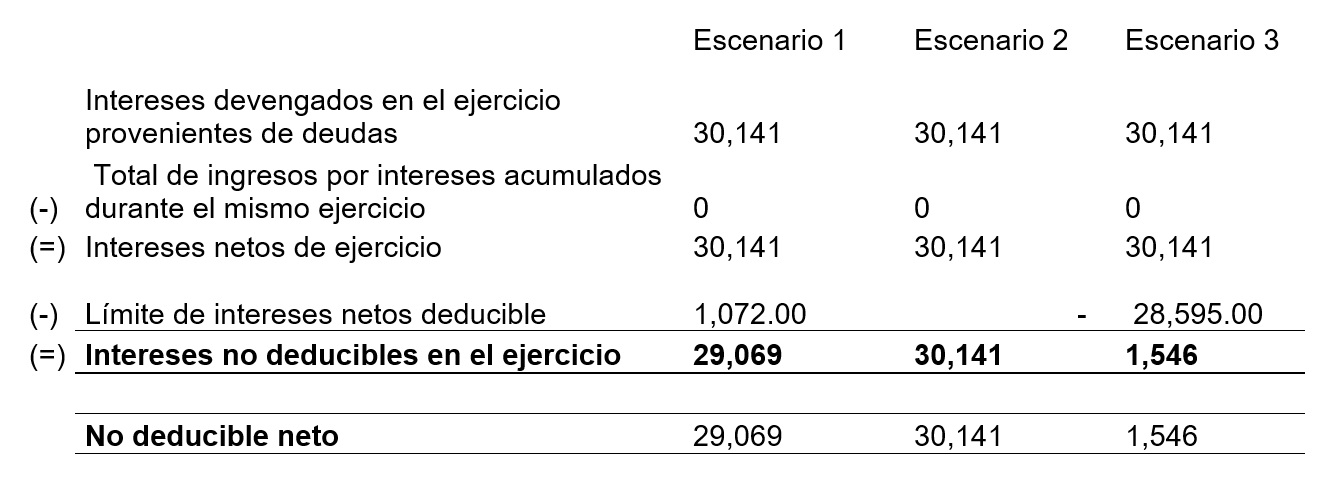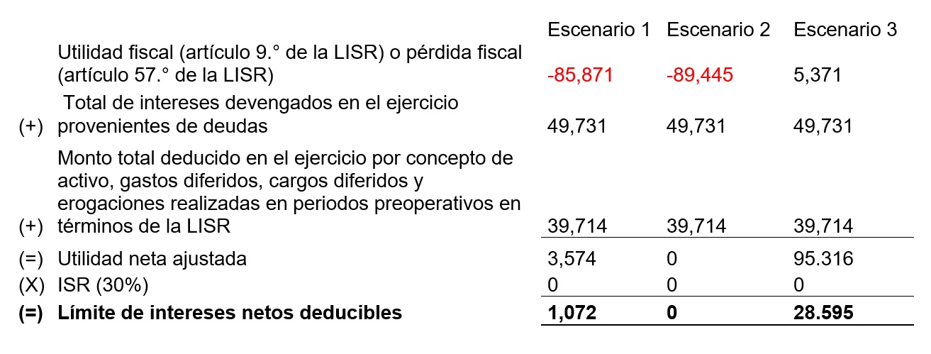 Habrá que observar que en el escenario 1 se tiene la posibilidad de efectuar una deducción a futuro de $29,069; en el escenario 2, de $30,141; y en el 3, de $1,546.