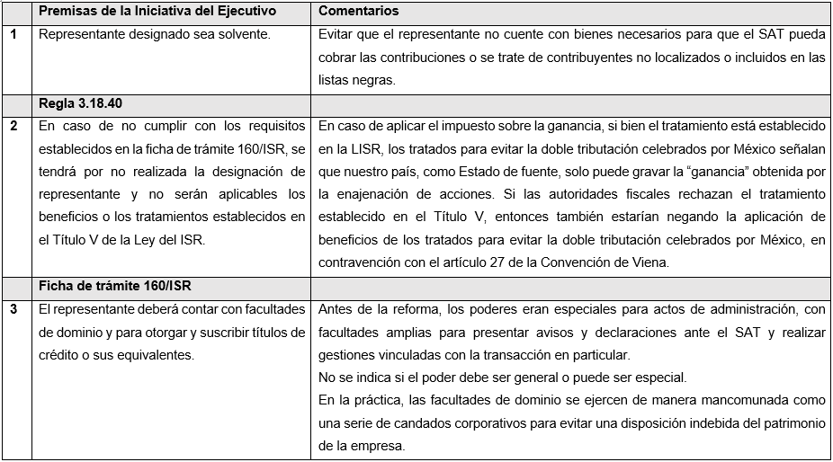 Para los efectos del artículo 174, primer párrafo de la Ley del ISR, la designación del representante de los residentes en el extranjero deberá realizarse conforme a la ficha de trámite 160/ISR “Designación del representante de residente en el extranjero”, contenida en el Anexo 1-A, antes de que venza el plazo para efectuar el entero del ISR que se haya causado, conforme a las disposiciones relativas y aplicables del Título V de la Ley del ISR. En caso de no cumplir con los requisitos establecidos en la ficha de trámite 160/ISR, “Designación del representante de residente en el extranjero”, contenida en el Anexo 1-A, se tendrá por no realizada la designación de representante y no serán aplicables los beneficios o los tratamientos establecidos en el Título V de la Ley del ISR.