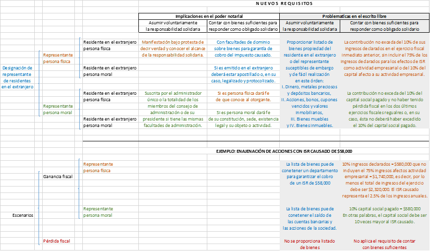 Las implicaciones en el poder notarial de los nuevos requisitos son: (i) manifestación, bajo protesta de decir verdad, de que se asume voluntariamente la responsabilidad solidaria y (ii) facultades de dominio sobre los bienes que garantizan el cobro del impuesto causado por el residente en el extranjero.
