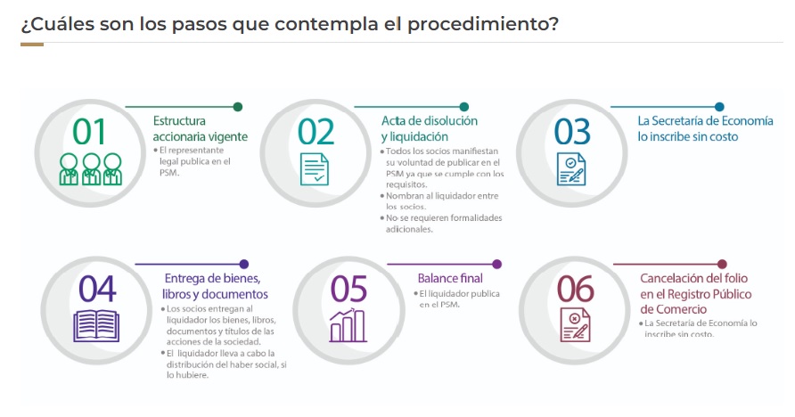 Con la finalidad de proceder con lo anterior, la Secretaría de Economía habilitó en su página de internet un micrositio denominado “Publicación de Sociedades Mercantiles” (https://psm.economia.gob.mx/PSM/), dentro del cual hay un apartado denominado: “Disolución y Liquidación” (https://psm.economia.gob.mx/PSM/entradaView1.jsf), que esquematiza los pasos a seguir, conforme lo siguiente: