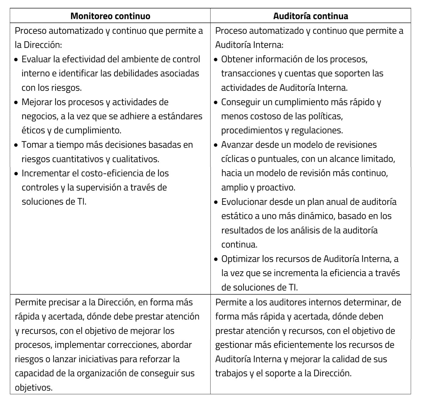 Fuente: elaboración propia, con base en Deloitte 2010. Continuous monitoring and continuous auditing: From idea to implementation, en Instituto de Auditores Internos de España, octubre de 2014, p. 9.