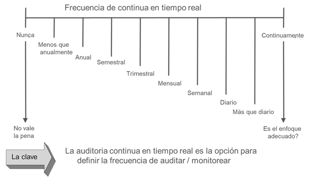 Pocos aspectos de negocio requieren análisis o auditoría “permanente” al ser ininterrumpidos y tener la atención constante en tiempo real. En lugar de ello, se requiere un proceso apropiado para determinar la “frecuencia” adecuada de la actividad de monitoreo o auditoría, que abarque localidades, procesos, transacciones, etc. en una organización.