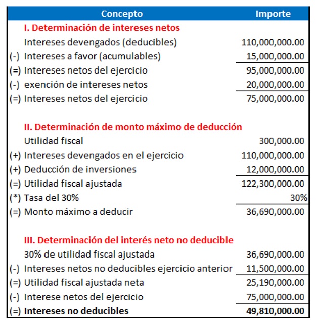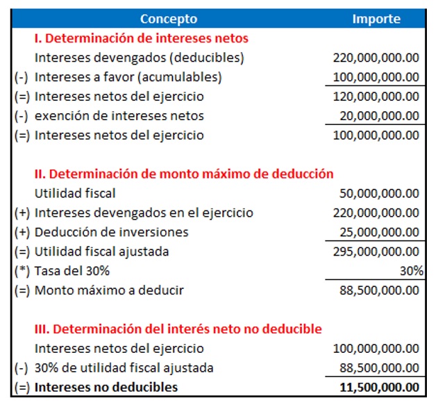 Con base en lo referido hasta el momento, a continuación se muestra un ejemplo de la mecánica que se deberá considerar para determinar los intereses netos no deducibles: