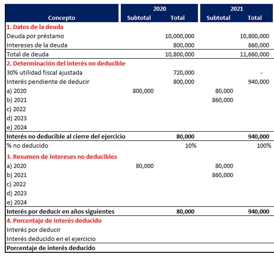 Con la reforma fiscal de 2020, se incluyó una mecánica que determina un efecto de gasto no deducible cuando se tienen intereses ya sea por deudas contratadas con terceros o con partes relacionadas. Si derivado de dicha mecánica se determinan intereses no deducibles, los mismos se podrán deducir en los siguientes 10 años, en la medida en que se cumplan ciertos requisitos.