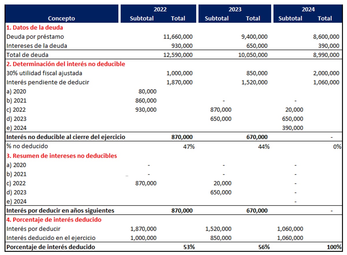 Como se puede apreciar en el ejemplo numérico, dado que los intereses empezaron a deducirse de forma parcial en 2022, se excluye del promedio de deudas el importe total del préstamo obtenido incluido; sin embargo, dado que de 2022 a 2024 se empezaron a deducir los intereses, se incluye en el promedio de deudas el importe total de la deuda existente al cierre de cada ejercicio.