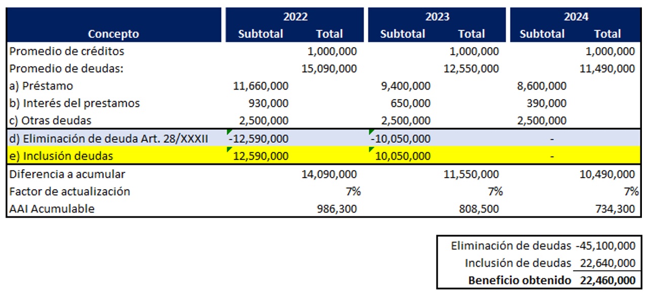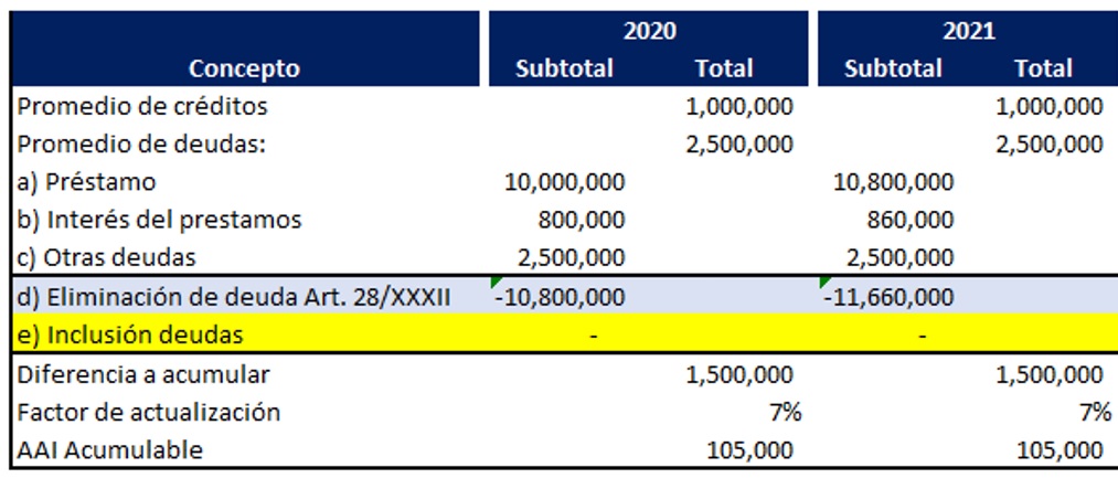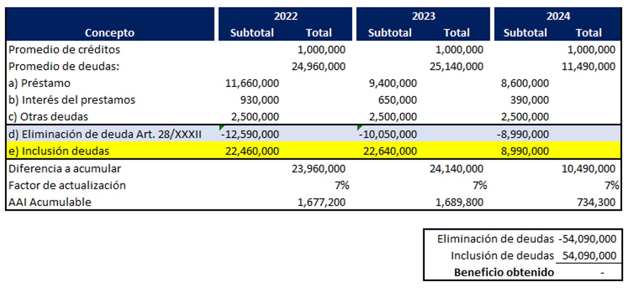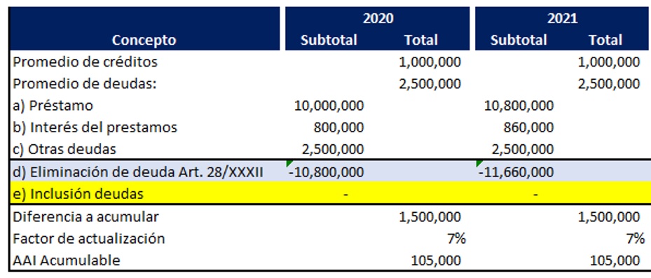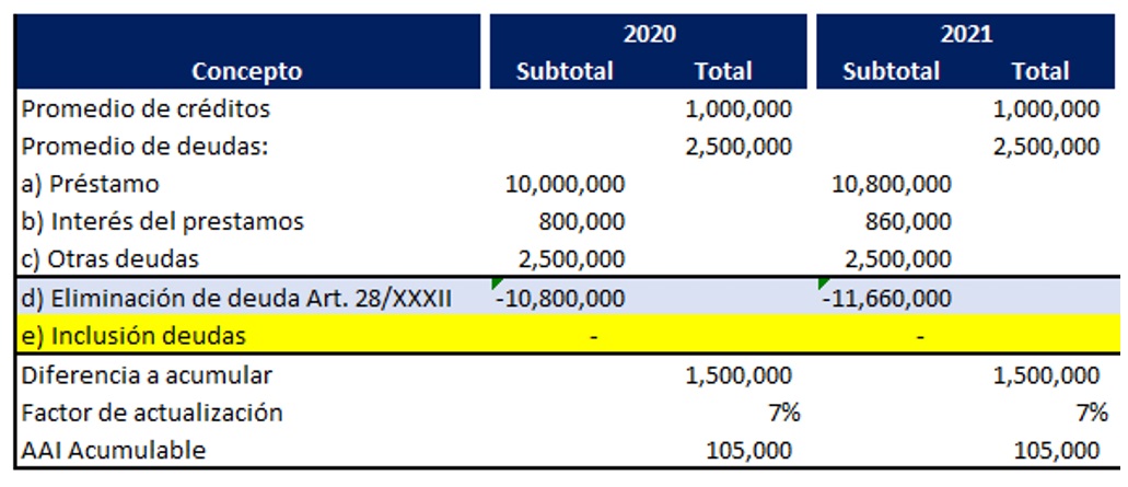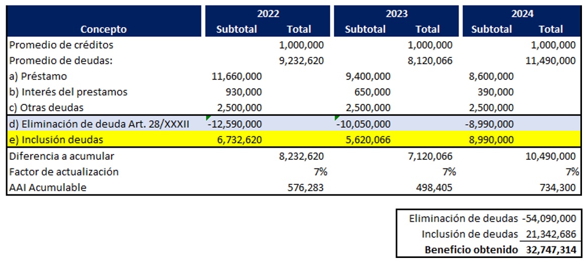Ahora bien, partiendo del hecho de que los dos escenarios mostrados anteriormente muestran un beneficio fiscal, a continuación, mostraremos un escenario en donde, si bien se excluye del promedio de deudas la deuda por préstamo en su totalidad, se incluye en el promedio de deudas el importe de deuda que se excluyó en años pasados.