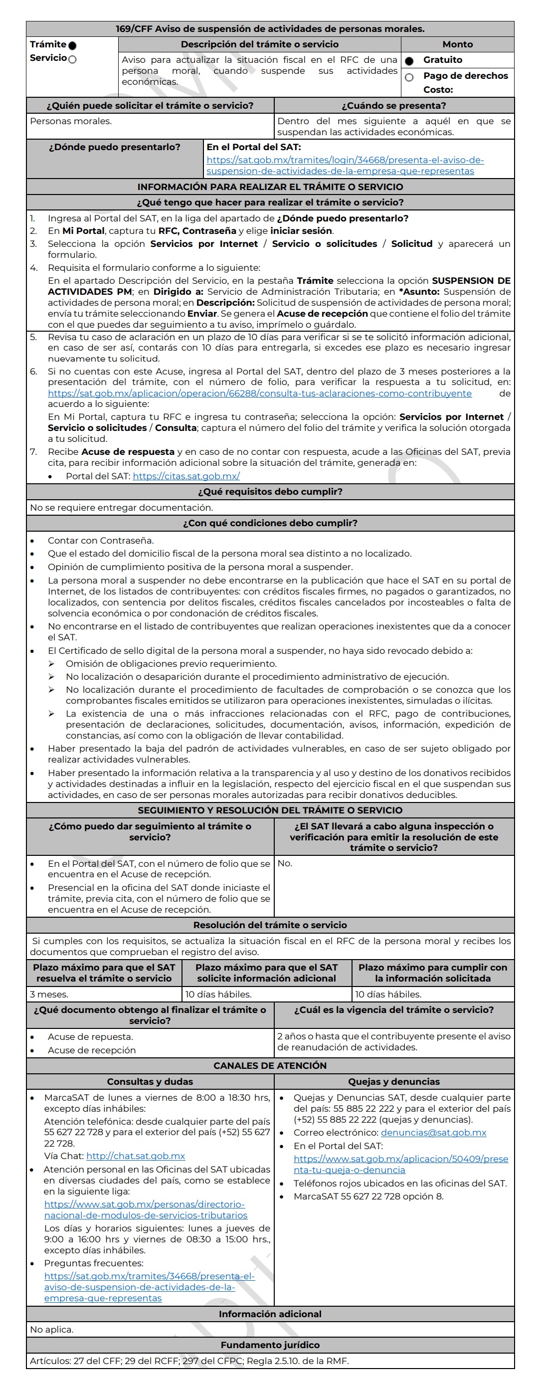 La suspensión de actividades de personas morales se hace mediante presentación de aviso ante el SAT, y se podrá conseguir siempre y cuando se atienda a lo dispuesto en la regla 2.5.10. de la RMF. Asimismo, se podrá realizar cuando no se deba cumplir con otras obligaciones periódicas de pago, por sí mismos o por cuenta de terceros. Ejemplo de ello es una empresa que ya no se encuentre operando, pero que aún mantenga activos a sus colaboradores; no podrá dar el aviso, pues siguen existiendo obligaciones fiscales que, como patrón, deberá cumplir por cuenta de sus empleados.
