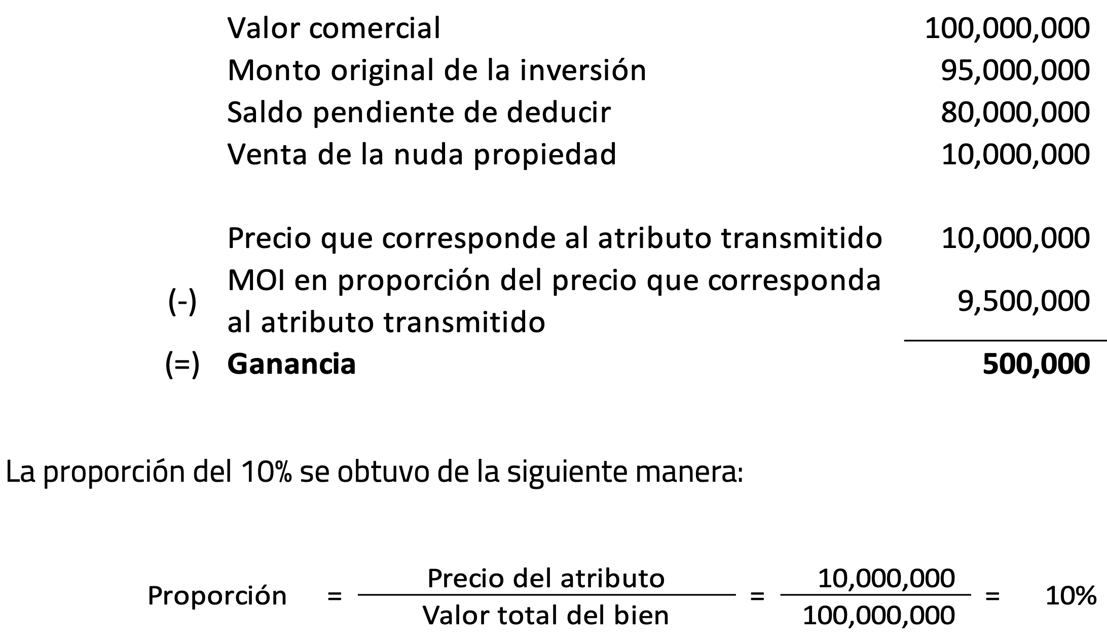 En caso de que el contribuyente enajene únicamente el usufructo o la nuda propiedad, la ganancia se determinará disminuyendo del precio, el monto original de la inversión, en la proporción que represente el valor de enajenación del atributo entre el total del valor del bien, con los valores que se indiquen en el avalúo que se realice por persona autorizada por las autoridades.