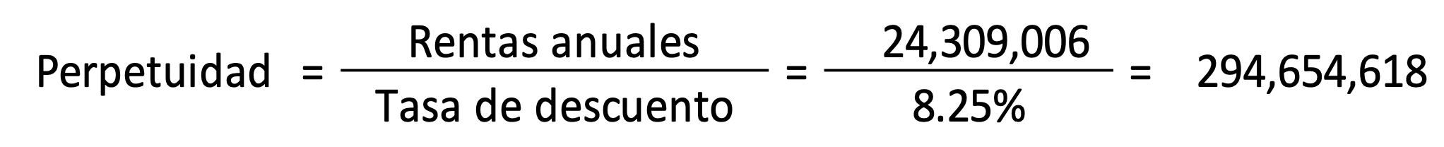 Un inmueble tiene un valor de mercado de $327,394,000 y genera rentas anuales de $24,309,006. El valuador consideró una tasa de descuento del 8.25%. La persona moral transmitirá la nuda propiedad y conservará el usufructo por un periodo de 7 años. La fórmula para conocer el valor presente de cada año es la siguiente:
